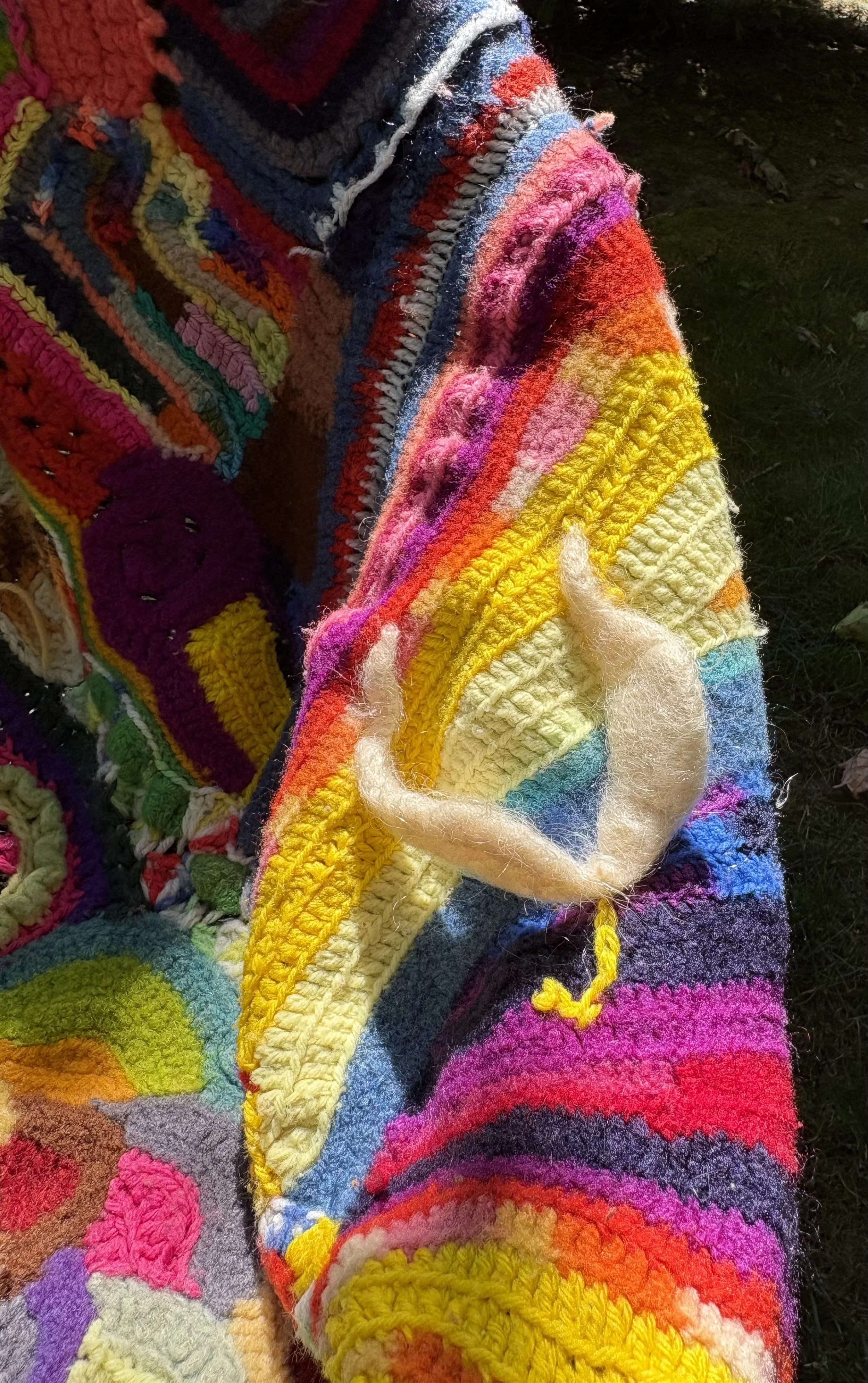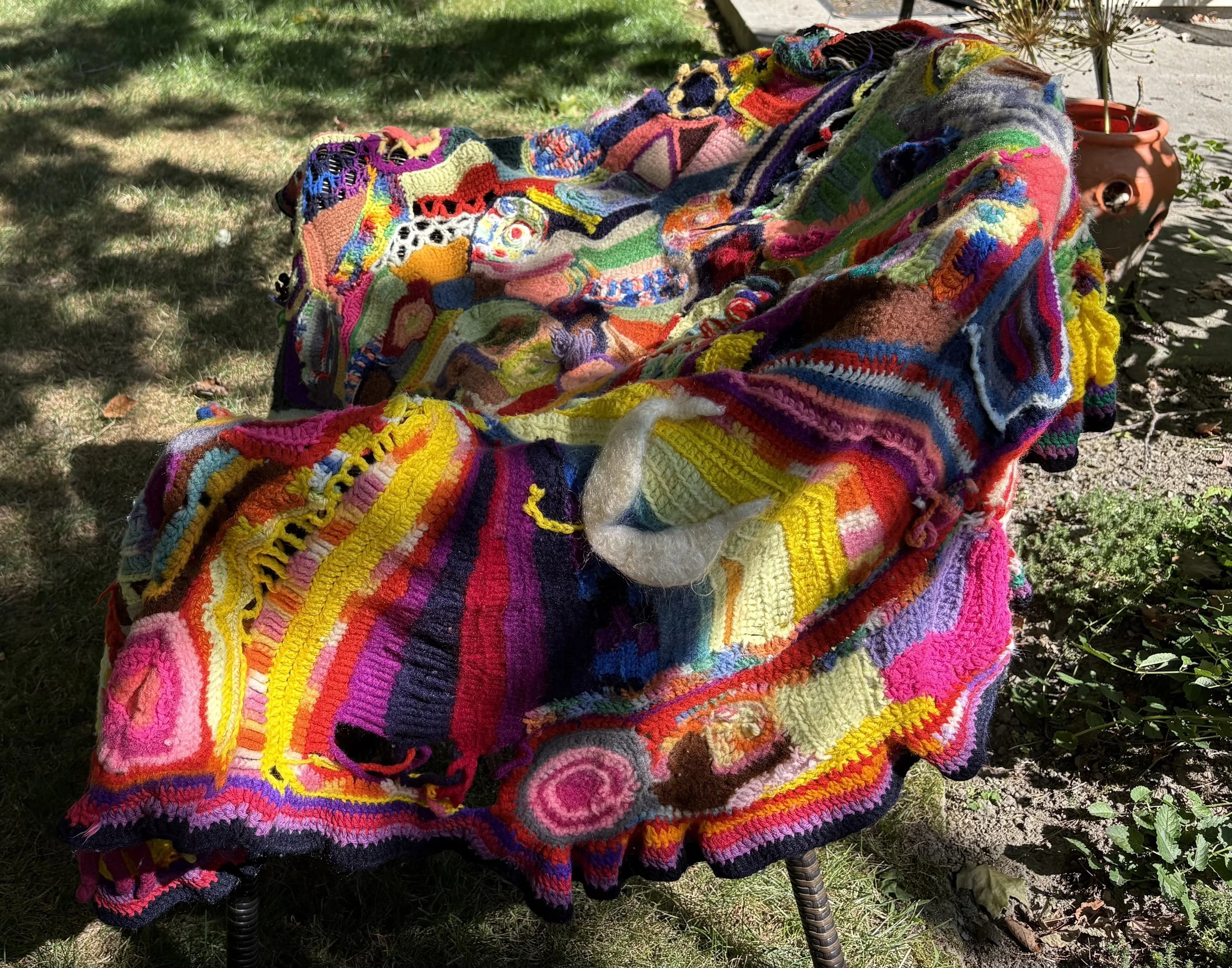 When I finished the scarf, I wore it a few times and then decided it should be the beginning of a whole afghan. My young daughter and her friends often picked which colors and shapes I might add next. There is even a small set of white wings carrying the letter, “J, in memory of a dear friend, Jonathan Longyear, who long ago died in a hangliding accident on a New Hampshire mountain.