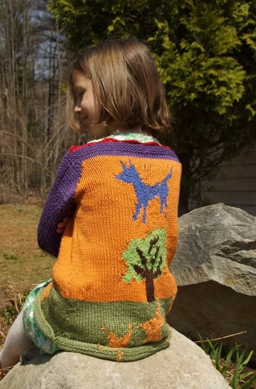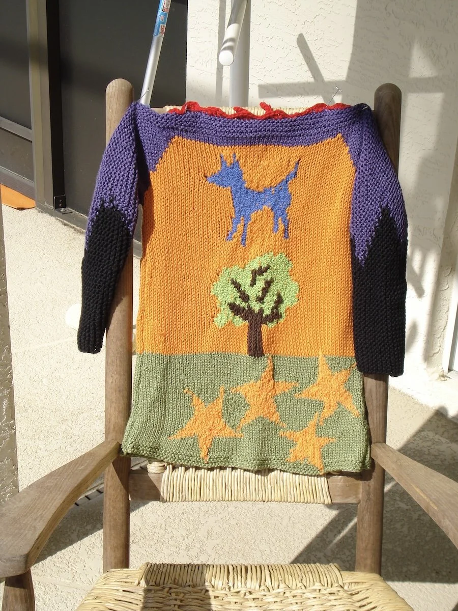 One day my granddaughter, Althea, asked me to make her a sweater. I replied, “Of course, but you have to design it.” Her drawing below shows her dog, Sadie, a big tree, and some happy stars. The bottom half of the sleeves are black. There is a red trim at the neckline. What she didn’t tell me was that the drawing showed the back, not the front.