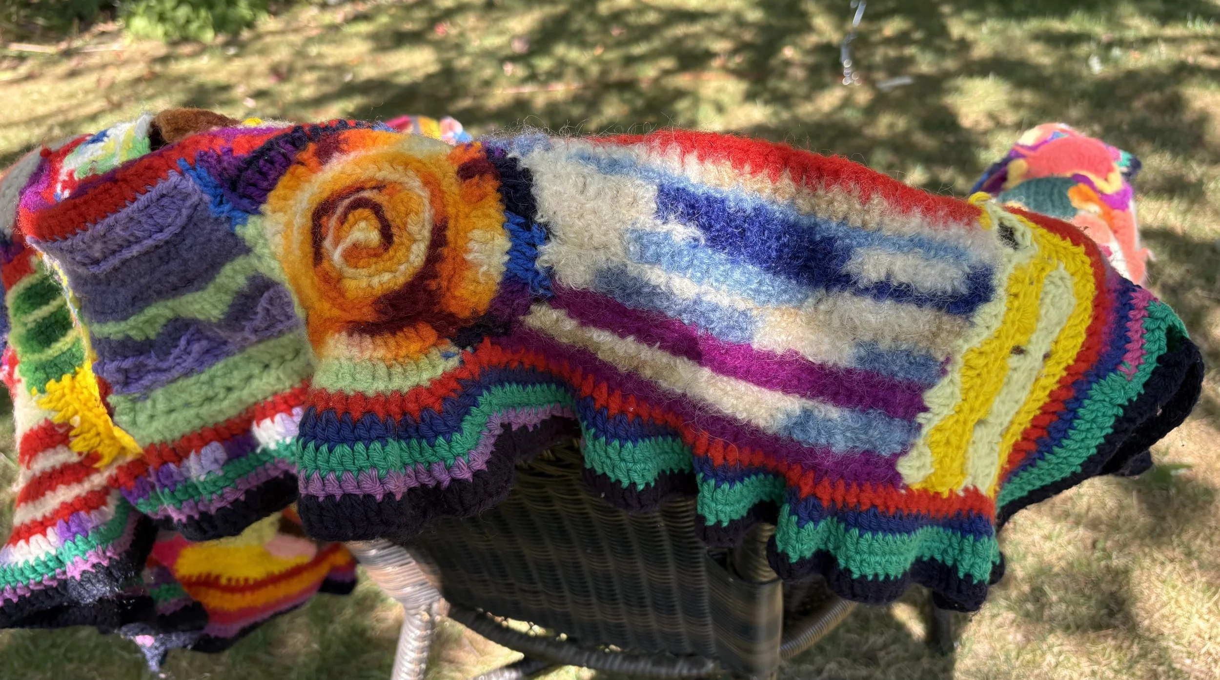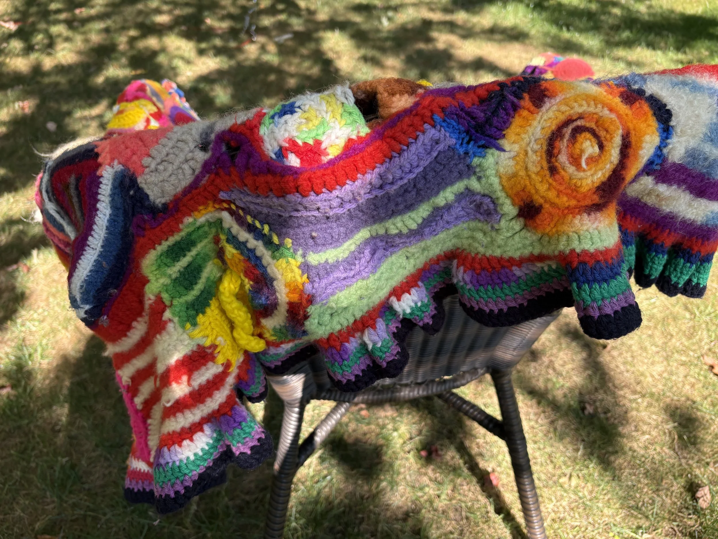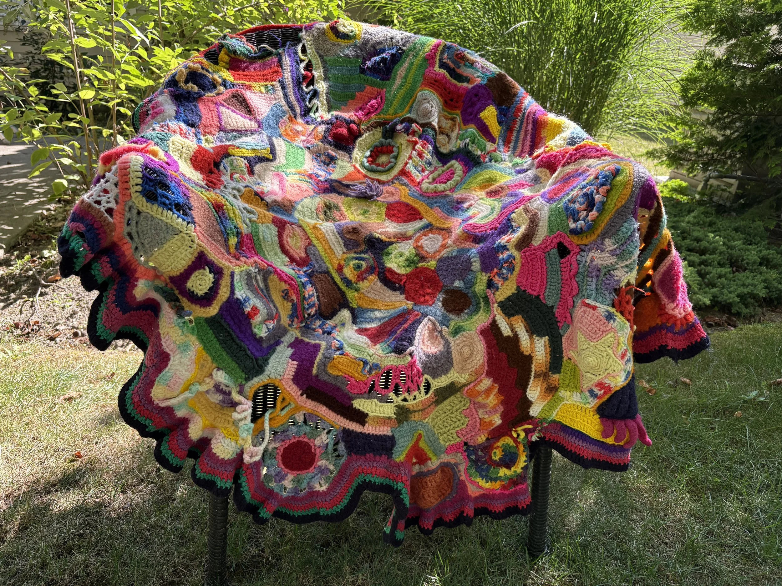 A long time ago, a good friend taught me how to crochet. (I had always liked those multicolored Granny Square afghans.) So I immediately bought a bunch of inexpensive yarn in several colors, all about the same weight and fiber. After I completed my first Granny Square, my brain said, “No way! Boring!” So, I used that ONE lone square as the beginning of a scarf. That allowed me to pick up the stitches on one side of my granny square, continue to crochet in whatever direction or shape and color I wanted, happily changing patterns and colors “in midstream.“ I made stripes and flowers, circles and loops, and weird sculptural parts.