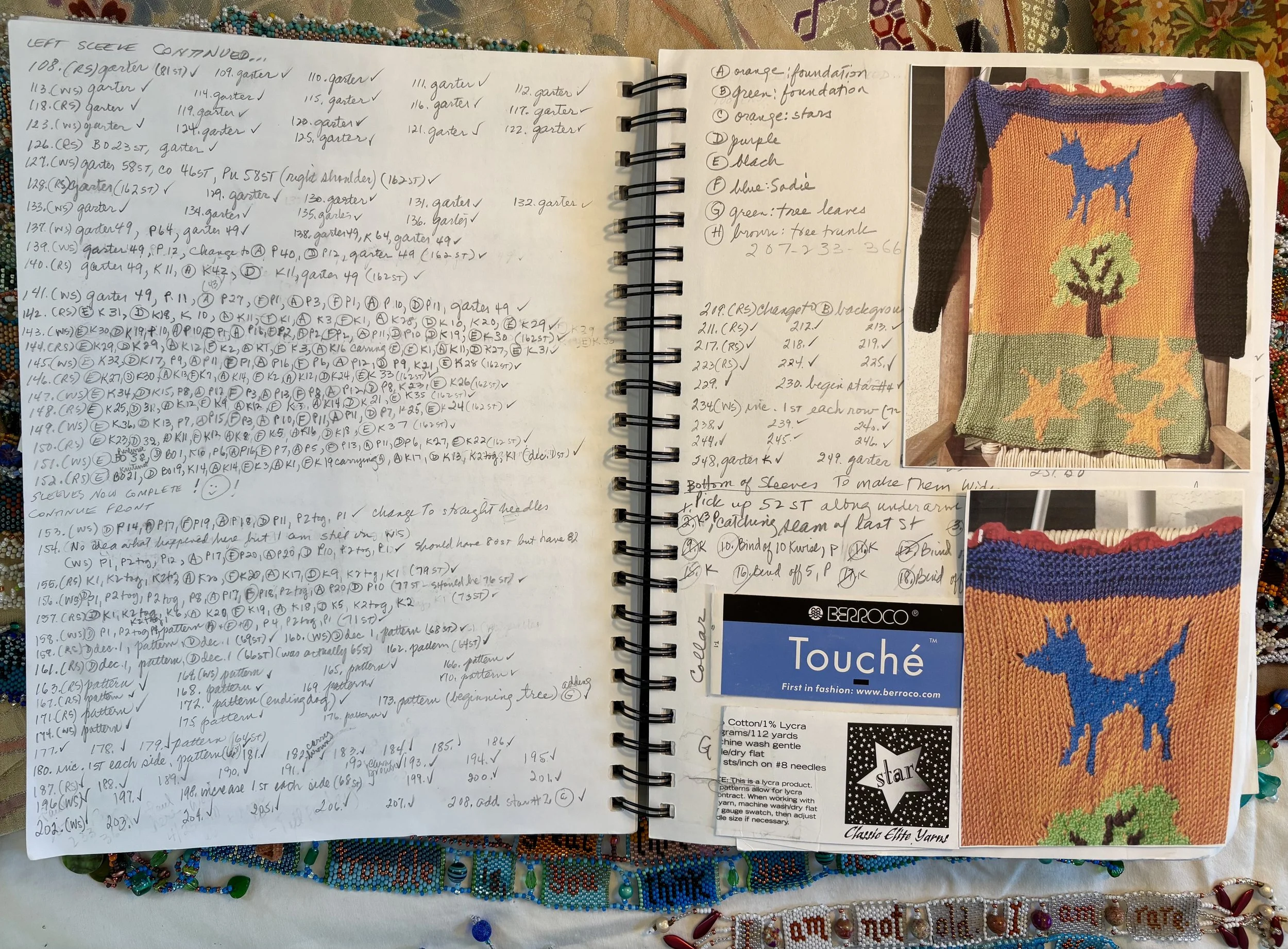 Later, a very patient person taught me how to knit and purl. But after trying to understand the directions of a sweater pattern and finding it hopeless, I decided to just look at an actual sweater and figure out how it was made. I’ve been knitting without patterns ever since. Instead I just sketch, very simply, the main concept of the design, and then begin. I note every color and every step in detail in my sketchbook as I go. In this section of the website you’ll find some examples of these sketchbooks.