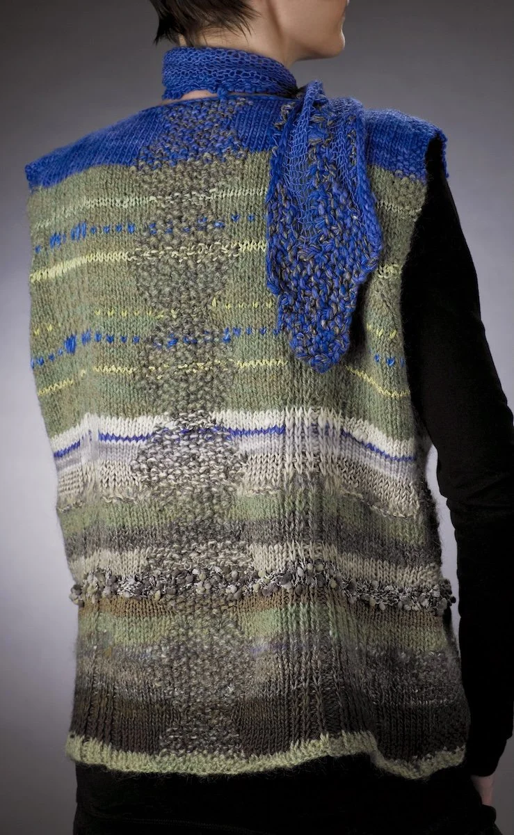 Along the way, I discovered that I hate sewing seams. So I design sweaters with the least possible amount of seam work. First, I make a swatch with the yarn that I refer to as the “foundation fiber." I use the swatch to estimate size measurements. Then, basically, I cast on and begin knitting. I start with the back bottom edge, continue to knit my way up the back (paying attention to how my design concept and yarn combinations are looking.) My designs always contain several different weights and types of yarn and fibers. When I get to the top of the back panel, I simply continue knitting - without stopping - over what will become the shoulders, continuing to knit until I reach the bottom of the front hem. (I have often had well-meaning friends describe my knitting method as “doing it wrong.” However, “doing it wrong”has taught me some exciting new stitches.)